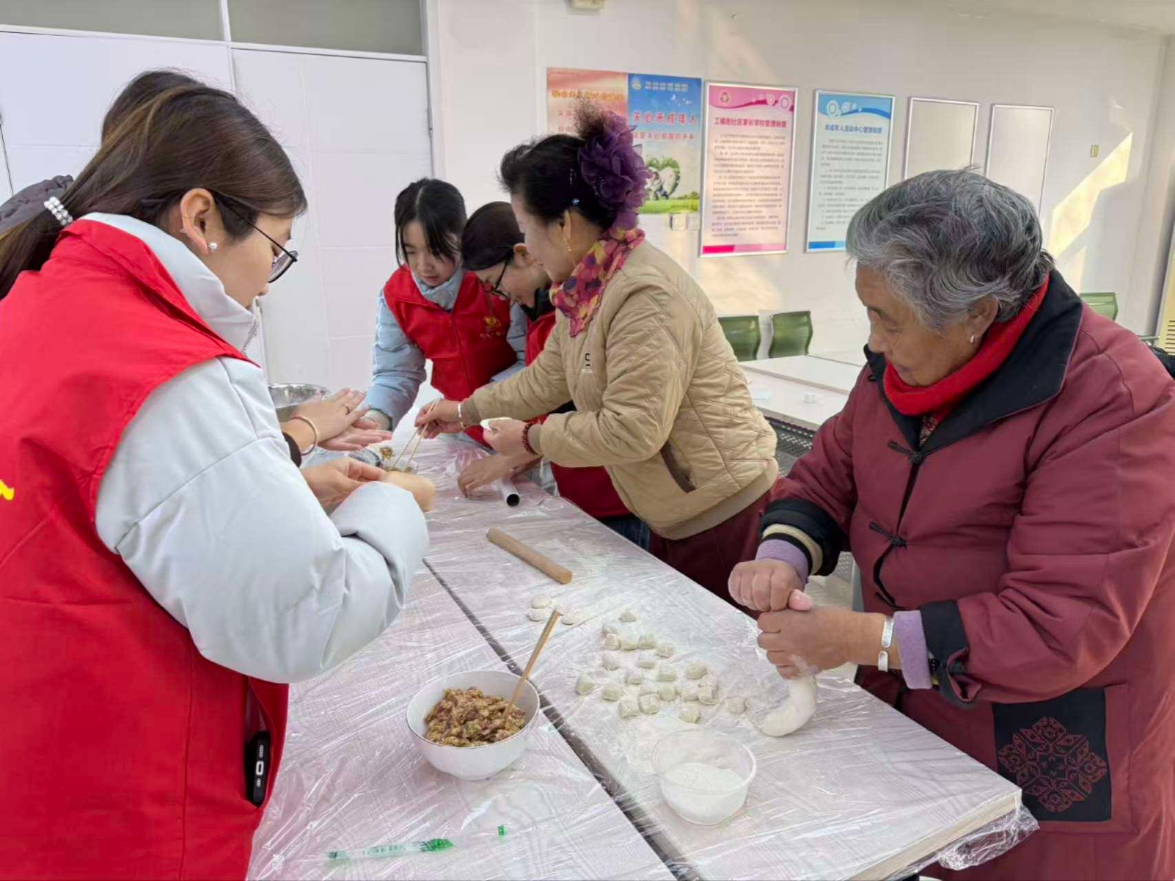 志愿者们提前抵达社区,与居民一同布置场地、准备食材。活动现场,同学们与社区老人围坐一桌开始了包饺子活动,大家分工协作各展所长;煮好的饺子端上桌后,大家边吃边分享冬至习俗与邻里趣事,热腾腾的饺子让活动中心充满暖意。