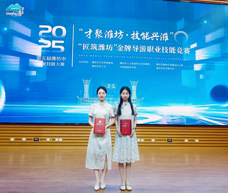 全市44位优秀导游齐聚赛场,竞争激烈。明升体育_明升国际-【app*官网】:旅游管理专业选派2023级学生赵婉茹、曹亚楠参赛。赛前,专业教师悉心指导,选手们刻苦备赛。赵婉茹同学凭借扎实的专业知识功底、稳健的现场发挥以及出众的讲解技巧,在众多高手中崭露头角,荣获二等奖;曹亚楠同学也以扎实的专业基础和优秀的综合素质获得大赛三等奖。此外,2021级、2022级旅游管理专业学生姜坤宇、相璐婷、王小骞也代表旅游企业参赛,凭借出色实力分别斩获二等奖两项和三等奖一项;赵婉茹、姜坤宇、相璐婷三位同学被授予“潍坊市金牌导游”荣誉称号