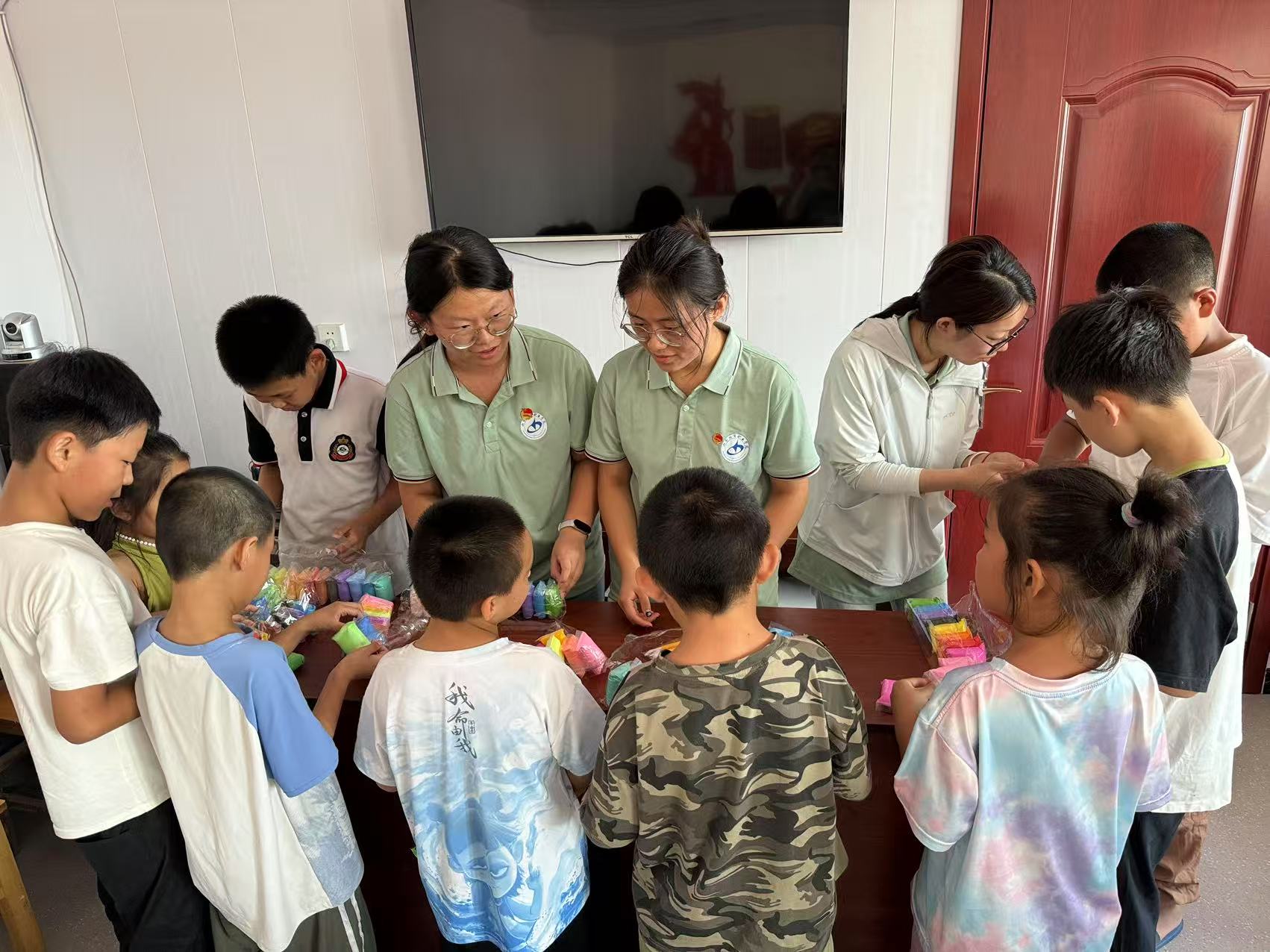 为丰富乡村儿童假期生活,团队联合村委举办“爱心托管在村委,儿童假期趣味营”,通过“防溺于未然”安全课堂、非遗漆扇制作、蔬果粘土创作等活动,传递安全知识与文化自信。孩子们在粘土上捏出南瓜、西蓝花等蔬果造型,在漆扇上绘制斑斓图案,既感受乡土气息,又激发创造力。团队还为村民制作寿光特色蔬果花篮,并赠送文具礼包,以暖心行动赢得村民赞誉。村委在感谢信中写道:“你们带来的不仅是陪伴,更让村里多了欢笑。”