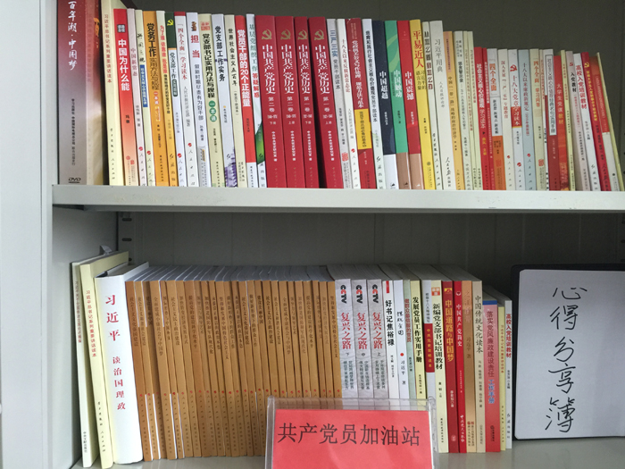 “加油站”书架上陈列着《习近平谈治国理政》、《中国共产党党史》、《复兴之路》、“三严三实”相关读物等书籍70余本,从内容上可以说“种类齐全、营养丰富”。在“加油站”,大家可以学习党的历史,让自己更加热爱党,坚定跟党走的信念;还可以学习先进党员的先进事例,从中学习他们的闪光点,从各个角度提高自己的修养和素质。下一步,工商管理系党总支将在每个办公室都设立一个党员“充电角”,以便于老师们在闲余时间学习充电,更加了解掌握党情国情,更好地发挥党员的先锋模范作用。
