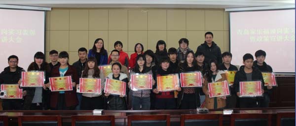 会上,徐晓囡对同学们在实习期间的优异表现给予充分肯定,对青岛家乐福商业有限公司表示感谢。高巍宣读了获奖学生名单,尹晓蓉经理对实习学生做了点评,并宣讲了家乐福的激励政策。家乐福实施公开透明的激励机制,根据员工的工作表现进行评估,本次共有18名同学分获防损之星、技能之星、卫生之星、速率之星、培训之星、服务之星等奖项。其中服务之星户晓冬返还顾客遗失现金的事迹得到了家乐福公司的高度肯定。2012级连锁经营管理3班学生户晓冬同学在机台捡到一顾客遗失的钱包,内有6000元现金和若干银行卡、身份证等重要物品,该同学在第一时间将所捡物品上缴家乐福服务中心,失主及时找回钱包后深为感动。