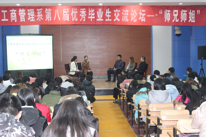 12月27日,工商管理系第八届优秀毕业生交流论坛——“师兄师姐”对话节目在第一报告厅举行。交流合作处处长刘莹,招生就业处处长赵星义,工商管理系主任李逾男、党总支书记高巍,工商管理系全体教师及2016级全体学生参加了交流活动。