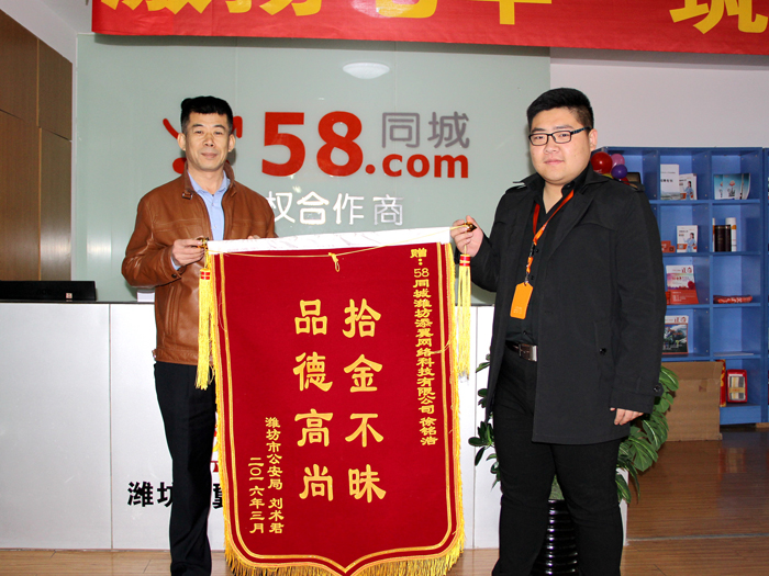 3月15日,刘先生将一面“拾金不昧 品德高尚”的锦旗送到了公司,并对徐铭浩同学表示了感谢。随后,潍坊添翼网络科技有限公司发来了喜报,对学校的教育和培养表示感谢。