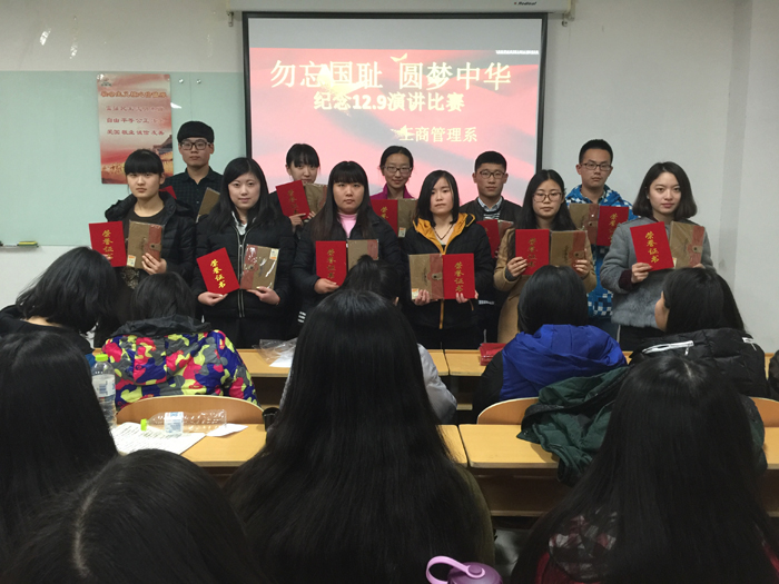 活动一“勿忘国耻,圆梦中华”演讲比赛,选手们以“一二?九”运动为题材,通过PPT、配乐朗诵、图片展播等多媒体形式,慷慨激昂的演讲,回顾了历史,展望了未来,激发了同学们励志成才、报效祖国的热情。