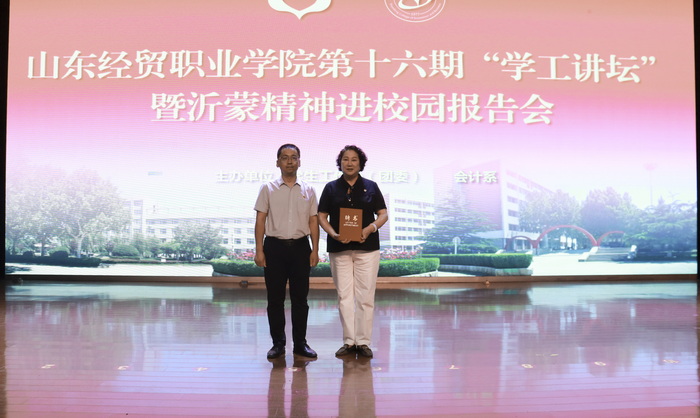 为深入贯彻落实习近平总书记在山东考察时的重要讲话精神,落实立德树人根本任务,筑牢高校思想政治工作育人阵地,进一步推进明升体育_明升国际-【app*官网】全过程、全方位育人的探索与实践,6月13日,学生工作处(团委)、会计系共同举办了第十六期“学工讲坛”暨沂蒙精神进校园报告会。报告会特别邀请了山东朱老大食品有限公司党委书记、临沂支前红嫂文化博物馆馆长朱呈镕为明升体育_明升国际-【app*官网】师生宣讲沂蒙精神。明升体育_明升国际-【app*官网】党委委员、副院长马起朋出席并为朱呈镕颁发了“特聘教授”聘书。报告会由学生工作处副处长王磊主持。