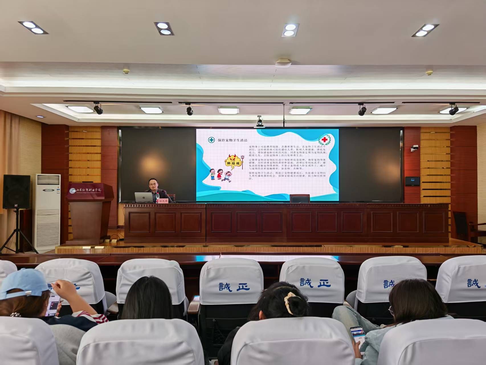 本次讲座紧扣校园传染病防控实际,孙夫宾主任以肺结核防治为核心,从肺结核的危害、致病原因、预防措施及认知误区四个方面展开系统讲解。讲座中,孙主任结合专业的医学知识和真实案例,详细阐述了肺结核对个人生活质量、工作学习、家庭生活的多重危害,剖析了先天免疫缺陷、不良环境、卫生意识薄弱等肺结核致病关键因素,并针对校园生活特点,提出了避免长期处于空调环境、养成良好运动后习惯、清淡饮食、保持宠物卫生等具体且实用的预防方法。同时,孙医师重点破除了 “肺结核患者必须和家人隔离”“农村地区更容易得肺结核”“无症状就不是肺结核” 等常见认知误区,让在场学生对肺结核防治有了科学、全面的认识,深刻理解了科学防控的重要性。