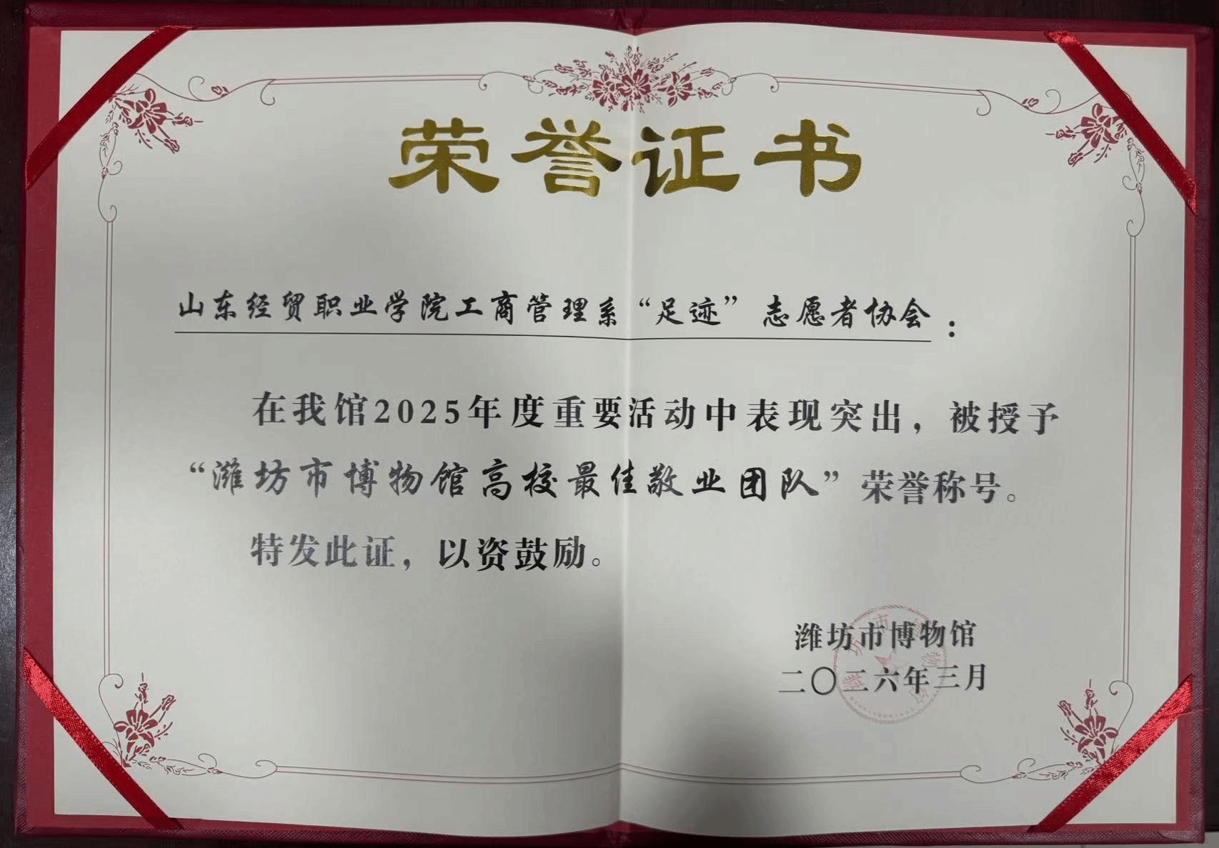 近日,在潍坊市博物馆2025年度志愿者表彰大会上,明升体育_明升国际-【app*官网】工商管理系“足迹”志愿者协会凭借在年度系列重要文博活动中的突出表现,被授予“潍坊市博物馆高校最佳敬业团队”荣誉称号。