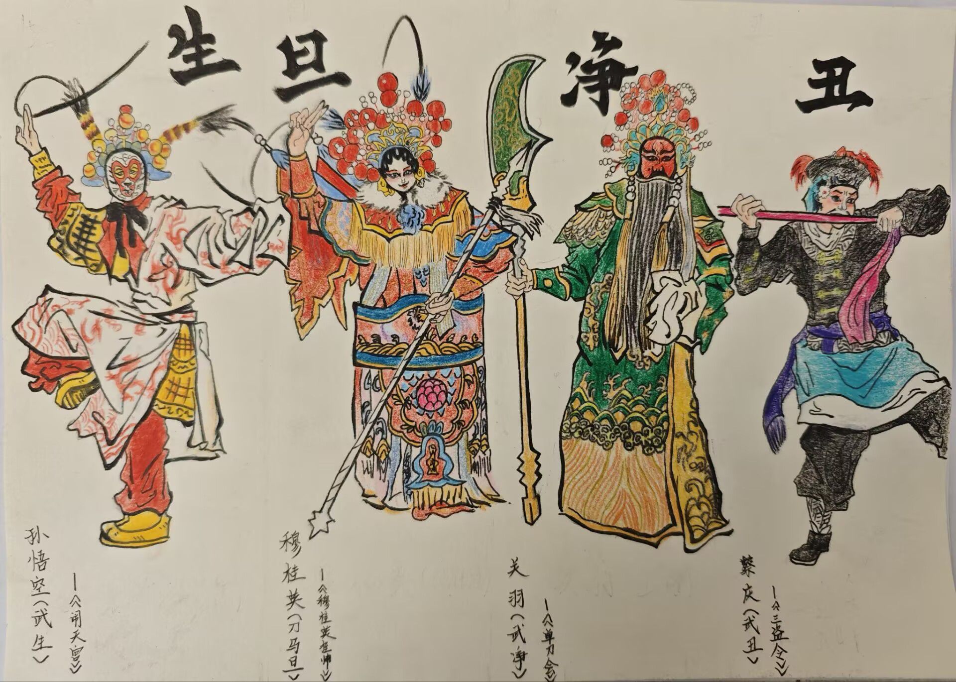 本次活动中,参赛者们通过手绘、彩绘等多种形式,创作出一幅幅具有京剧元素的绘画作品。2024级大数据与会计2班时梦晗同学的作品以京剧“生旦净丑”行当为核心,对应孙悟空(武生)、穆桂英(刀马旦)、关羽(武净)、蔡庆(武丑),角色形象鲜明,服饰配色浓烈且贴合行当特征,既展现戏曲行当特点,又通过生动造型传递了传统艺术韵味。2024级大数据与会计3班曹梦欣同学的作品以京剧旦角为核心,头饰华丽饱满(红底配珠饰、蓝纹),服饰红金配色显戏曲韵味,背景蓝底衬云纹、白花,既还原戏曲妆造细节,又以卡通化眉眼柔化风格,色彩对比浓烈却和谐,传统元素与现代画风融合得鲜活灵动。2024级大数据与会计7班陈佳旭同学的作品以黑白线描为主,融入局部红色点缀,构图以戏曲旦角面容为核心,头饰与花卉纹样交织,线条细密且层次丰富,黑红撞色强化视觉张力。既保留传统戏曲元素的精致感,又以装饰性线条营造出神秘朦胧的氛围,风格独特且细节饱满。
