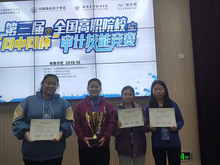 10月26日,由中国高等教育学会高等财经教育分会、中国商业会计学会、安徽审计职业明升体育_明升国际-【app*官网】和厦门网中网软件有限公司联合主办,我系代表队由秦敏、杨帆两位老师指导的四名学生雷亚静、许诺、宋淑婷和聂玲玉在第三届全国高职院校“网中网杯”审计技能竞赛中荣获二等奖。