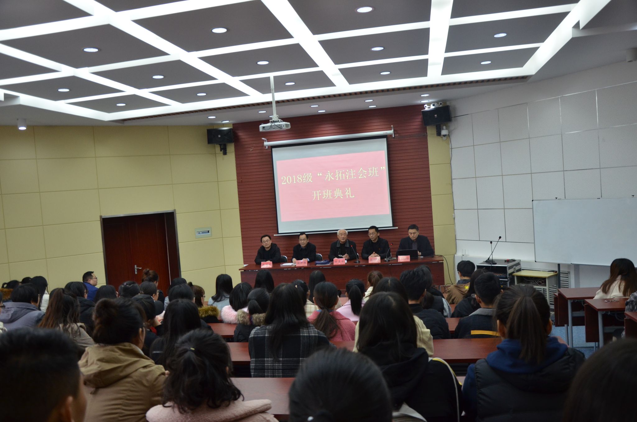 2018级“永拓注会班”于大一第一学期末组建,是从2018级会计专业11个班近600名学生中经过严格统一笔试择优选拔录取的,班级人数为49人,本学期已正式开课。