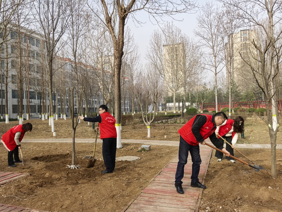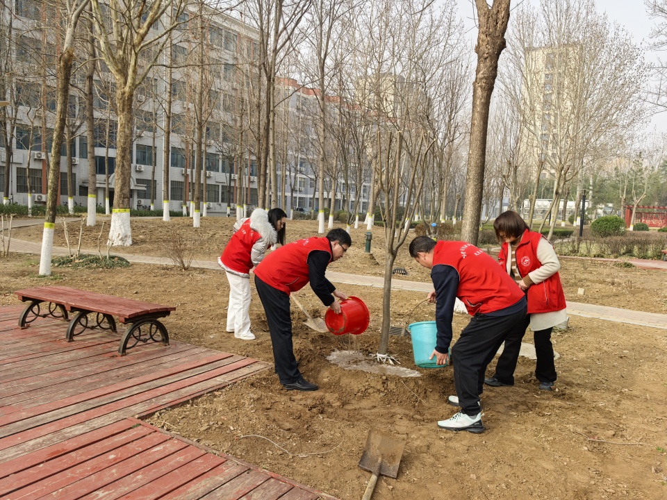活动当天,春风和煦。全体志愿者热情高涨,分工协作,挥锹铲土、扶苗培土、提水浇灌,现场一片热火朝天的劳动景象。大家配合默契,每一道工序都认真细致,确保树苗栽种成活率。经过大家的辛勤劳动,新栽种的树苗在校园9号公寓楼北侧迎风挺立,为初春的大地增添了勃勃生机。